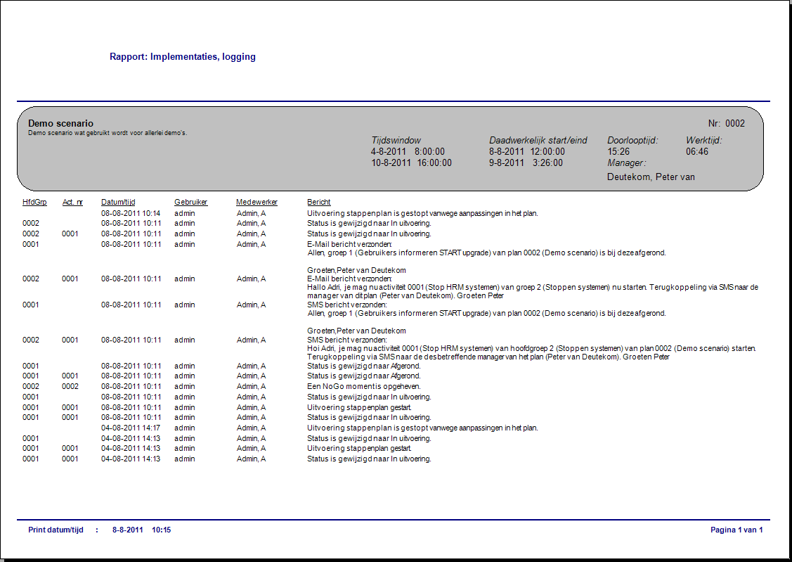 Ook alle communicatie berichten die Time IT automatisch uitstuurt (nadat ze vooraf zijn gedefinieerd) worden gelogd. En eventueel kan een medewerker zijn ervaringen delen middels een extra optie: Opmerking binnen Time IT. Deze worden ook gelogd en zijn na de uitvoering te gebruiken bij de evaluatie.